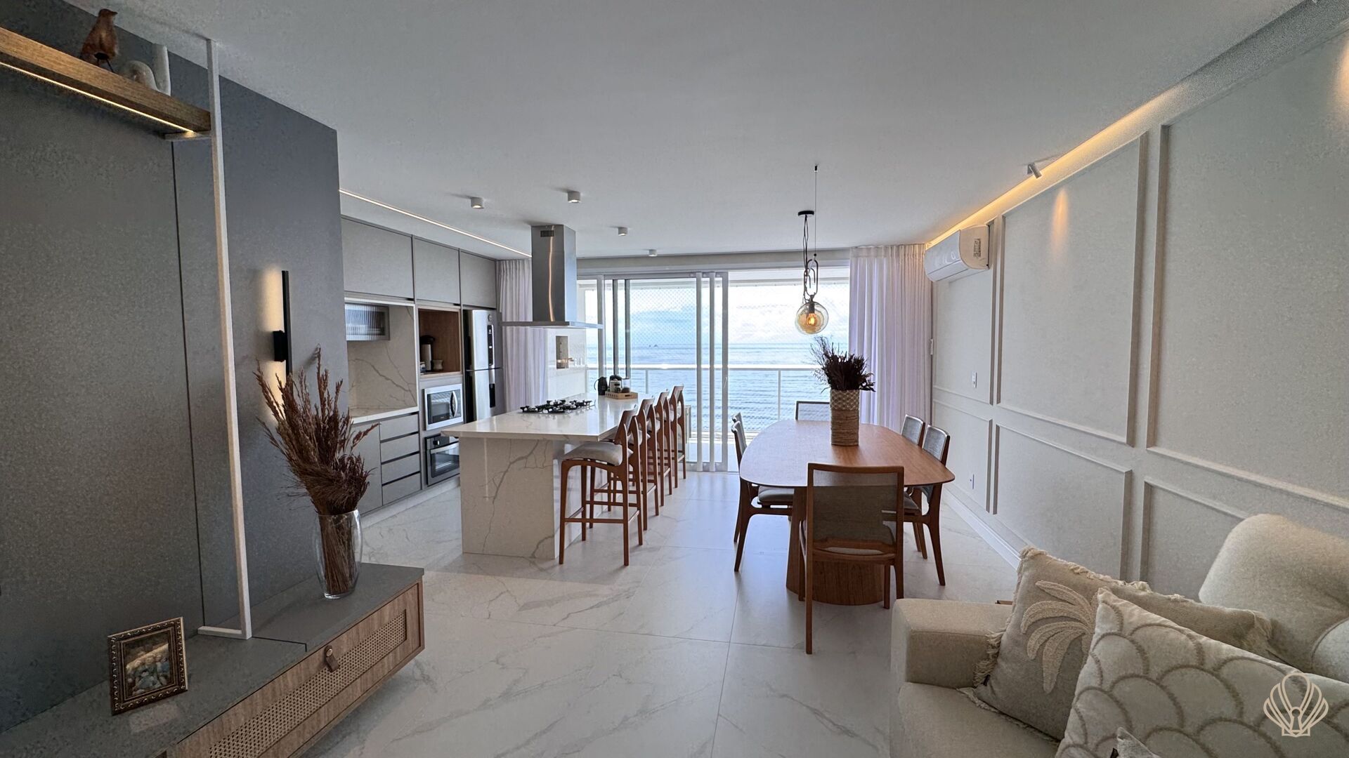 O living integra sala de estar, jantar e um espaço gourmet elegante, onde é possível cozinhar apreciando o mar ao fundo. A sacada generosa amplia ainda mais a experiência, com vista total e permanente de toda a orla.